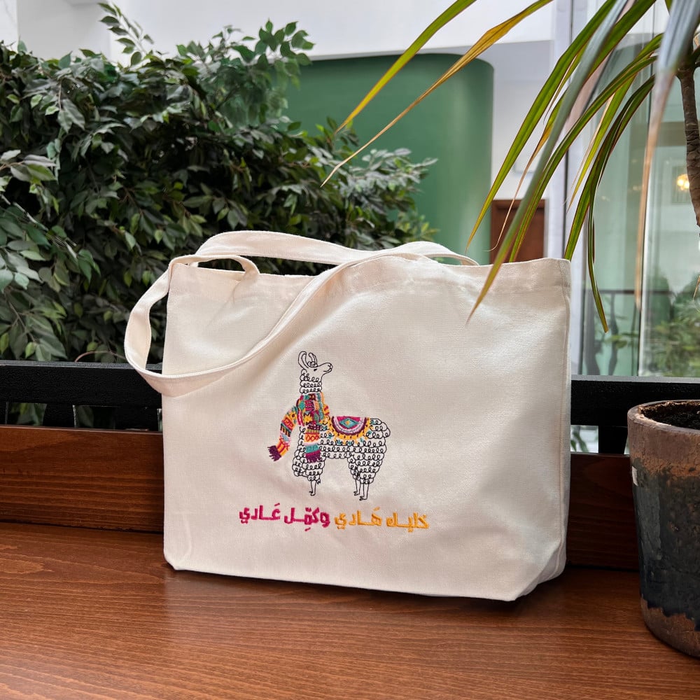 صندوق "خليك هادي" يحتوي على تي شيرت مُطرز بعبارة "خليك هادي وكمِّل عادي" وكيس قماشي مُطرز بنفس العبارة مع "لامة" رائقة 😌